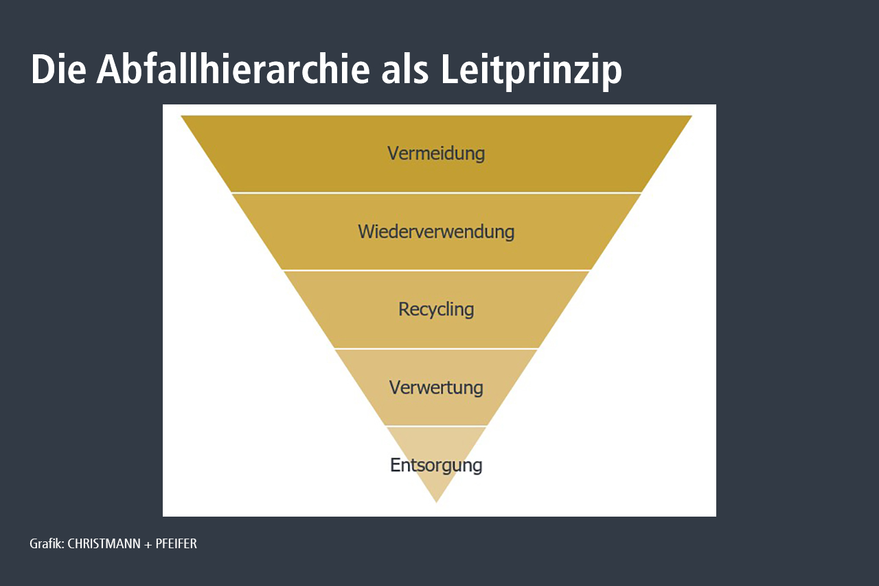 Ein zentraler Baustein der Kreislaufwirtschaft ist die sogenannte Abfallhierarchie. Sie legt fest, wie mit Materialien nach ihrer Nutzung umzugehen ist und priorisiert dabei die Optionen von der ökologisch sinnvollsten bis zur am wenigsten nachhaltigen Option.
