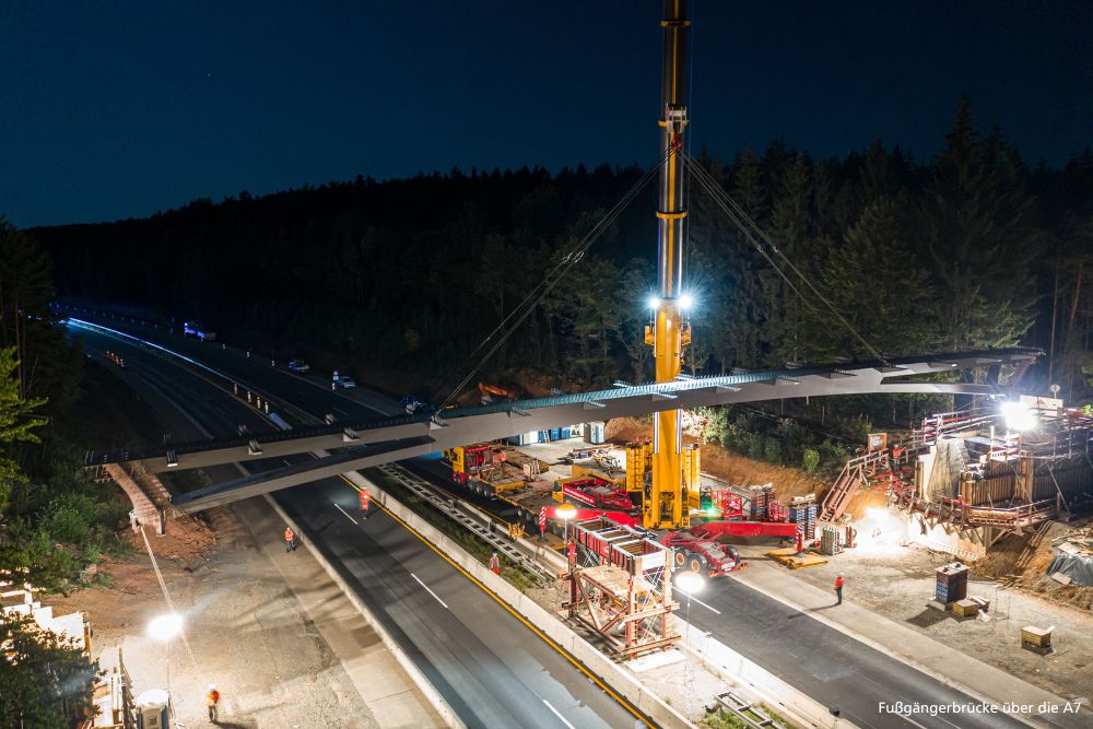 Ausgeführt als Einfeldrahmen, in zwei Hälften zur Baustelle transportiert und innerhalb einer Nacht vollständig montiert ist die Pelzkappe nun als Forstüberführung über die A7 bei Schondra im Einsatz.