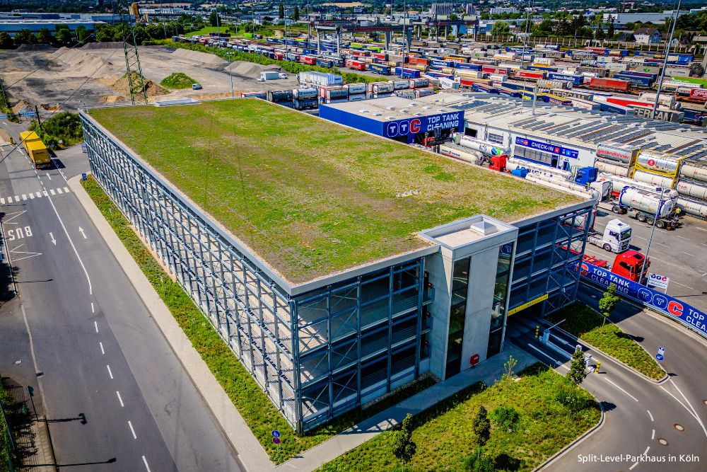 Zum Einsatz kamen 210 unserer im Werk vorgefertigten Preflex®-Parkdeckplatten, die in Split-Level-Bauweise verbaut wurden. Mit Technik für Elektromobilität ausgestattet, Gründach und Rankfassade ist das Parkhaus bestens für die Zukunft gerüstet.